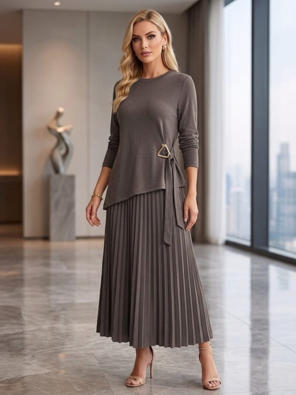 Asimetrik Pliseli Etekli Takım Kahverengi