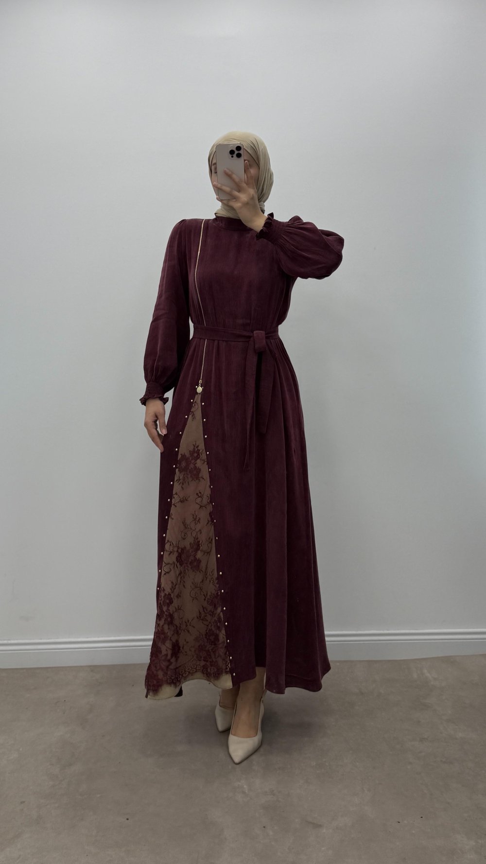 Marcha Prive Dantel Detaylı İpek Kupra Elbise Bordo
