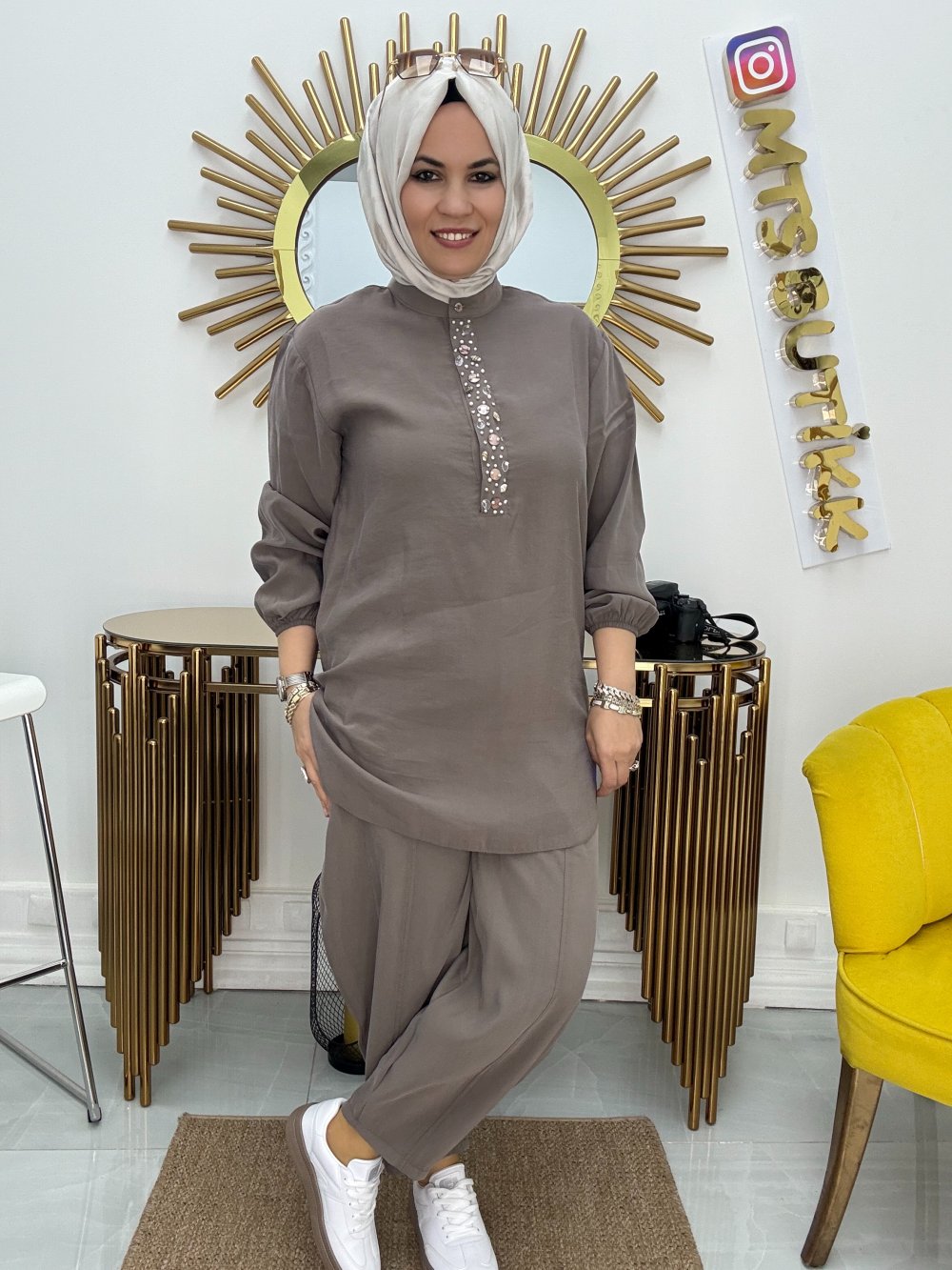 Bisiklet Yaka Taşlı Takım  Taş Rengi