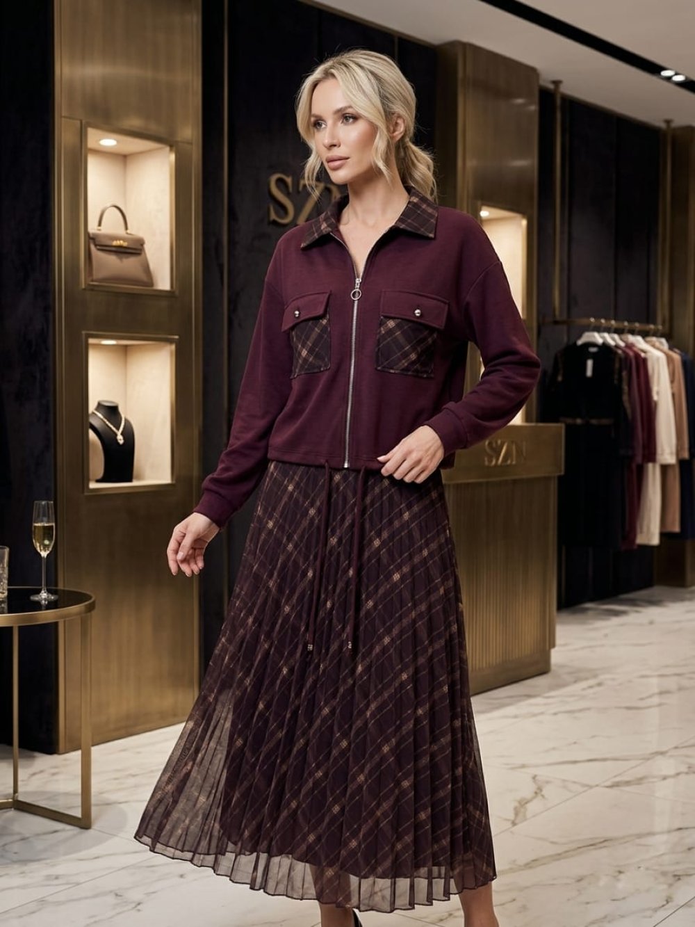 Asimetrik Pliseli Etekli Takım  Mürdüm